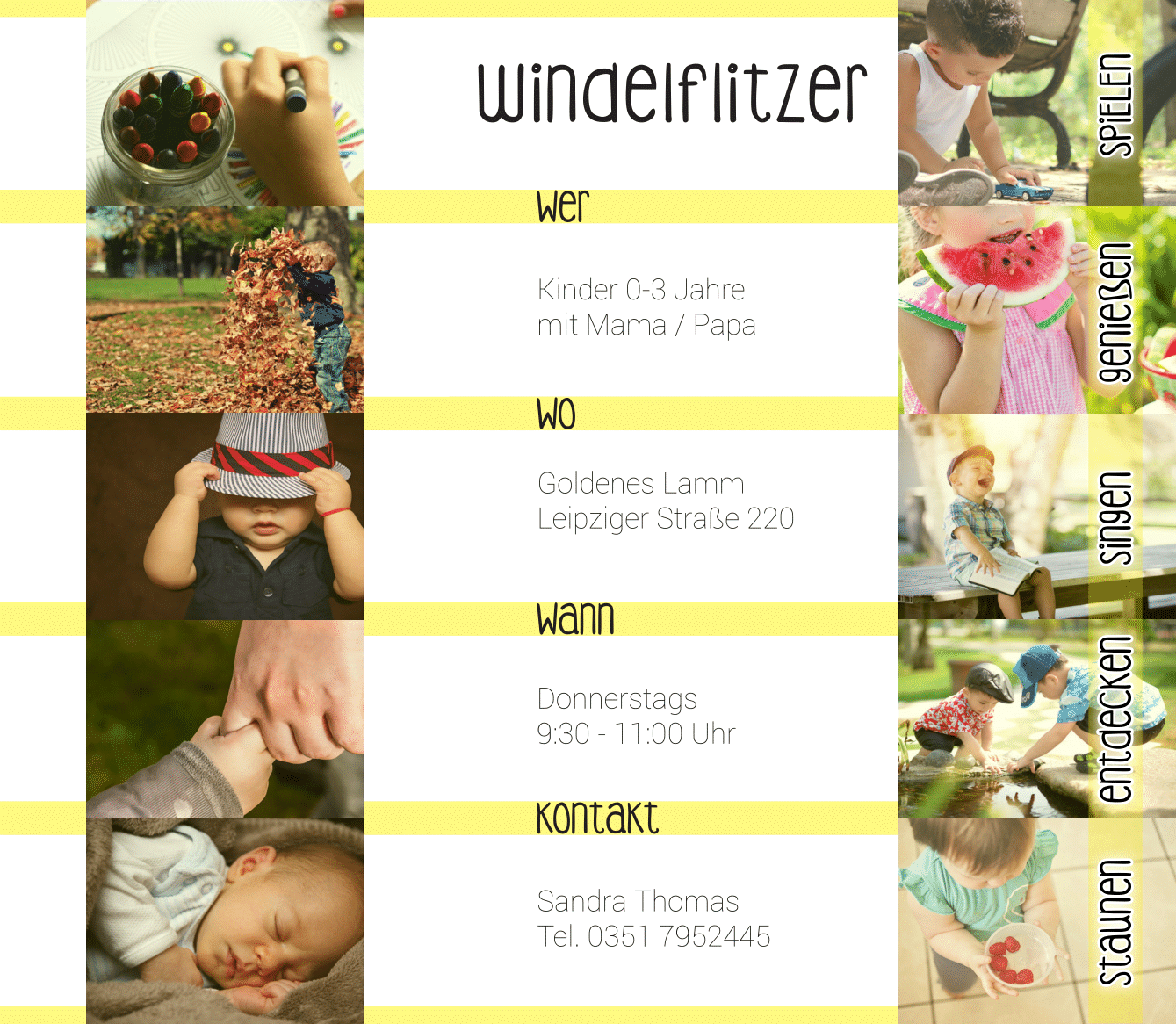 Die Windelflitzer sind für Kinder von 0-3 Jahren. Wir treffen uns in der Regel jeden Donnerstag. Mit dabei sind natürlich Mama oder Papa. Was wir machen? Spielen, singen, essen, Gottes Welt entdecken und darüber staunen. Seid ihr neugierig geworden? Dann meldet euch doch kurz unter eltern-kind-treff@dresden.feg.de.